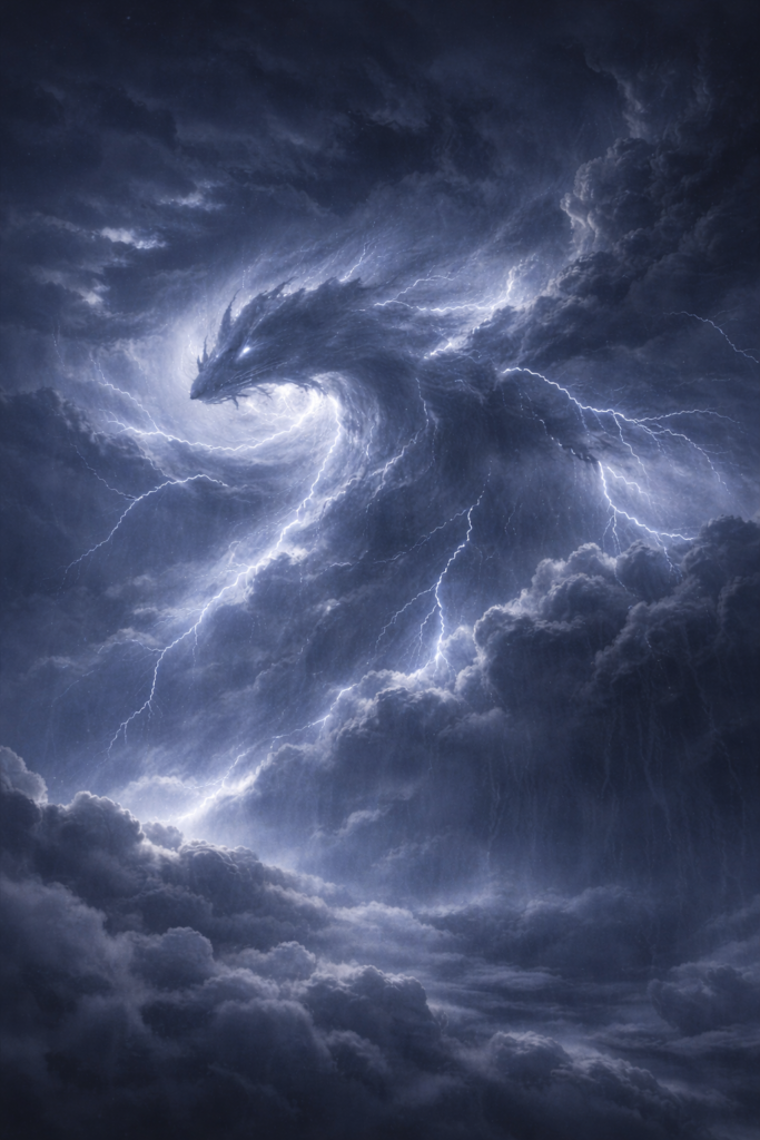 Gile’Stoirm is spoken of more as a living storm than a creature. Accounts describe sudden pressure drops, electrical discharge, sleet forming without warning, and thunder that seems to roll from within the sky itself.