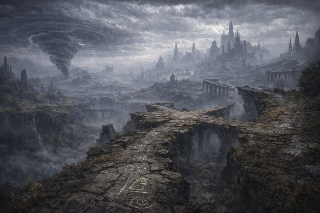 It waits where routes fail and crossings turn unreliable. Lightning crawls inside it like veins, and the wind sounds almost like breath. Some claim they heard their own name spoken from within the thunder.
