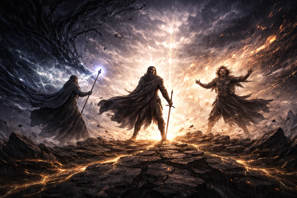 In that breaking, six moved instead of waiting. Each faced a different fracture of the world. One walked beyond known rules and returned alone. One called the wild to stand rather than conquer. One met terror with laughter and forged what others would later need. One walked storm and shadow with a faithful beast, lifting the lost where no roads remained. One slipped through locked empires, breaking chains without ruling. One stood between crowns and armies, speaking until violence forgot its purpose.