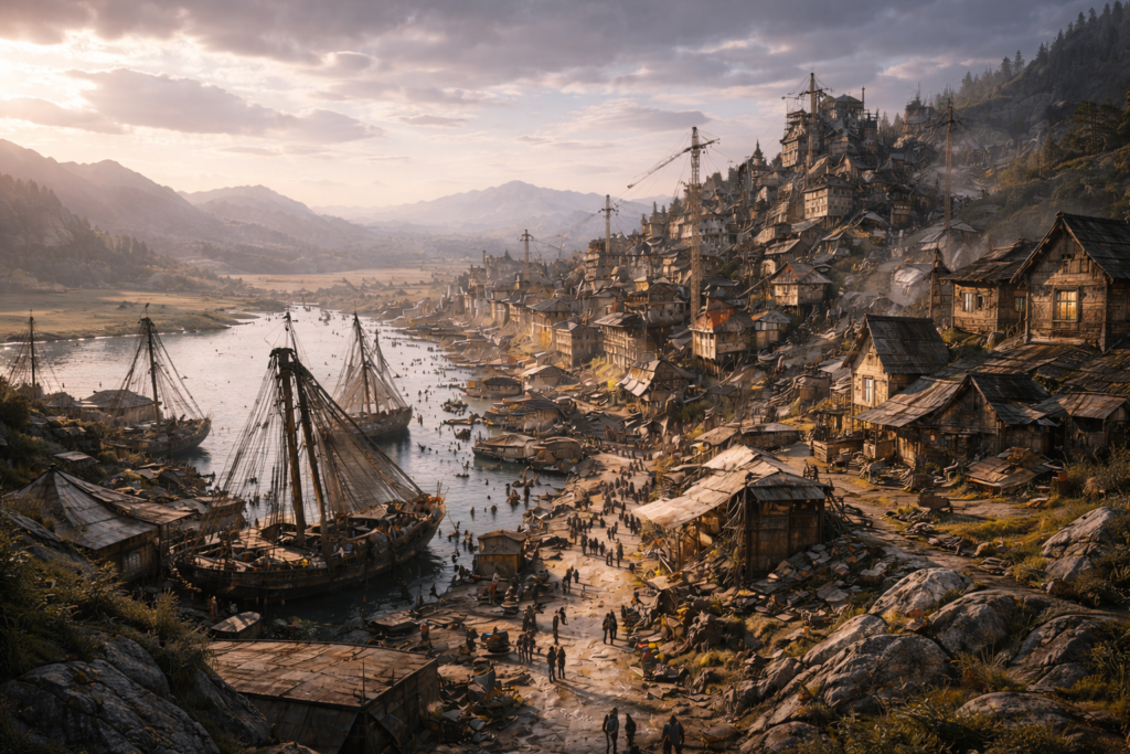 Riverbend is a practical trade town built around a wide, unpredictable river. Barges, ferries, and seasonal markets define its economy, and most residents are accustomed to rebuilding after floods rather than preventing them entirely. Life here rewards adaptability and local knowledge.